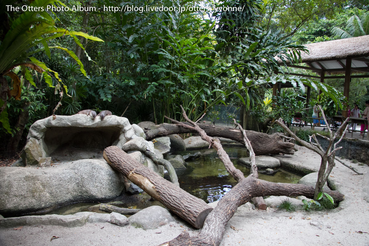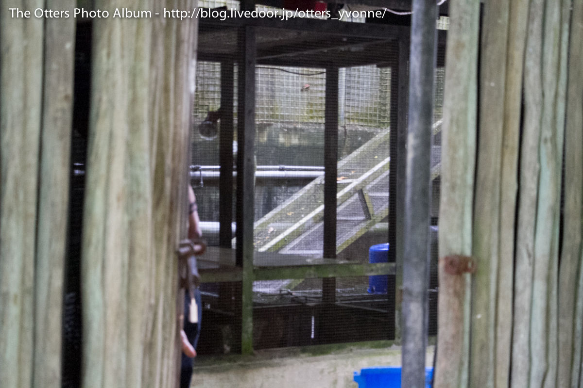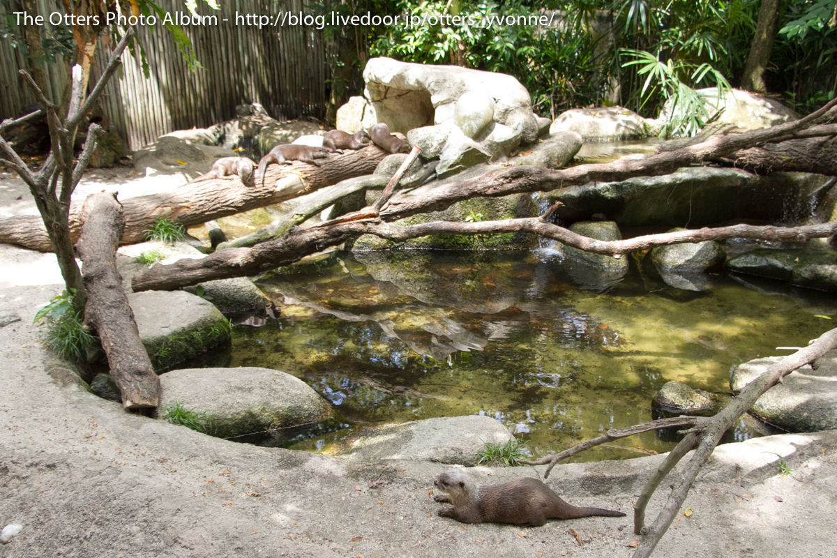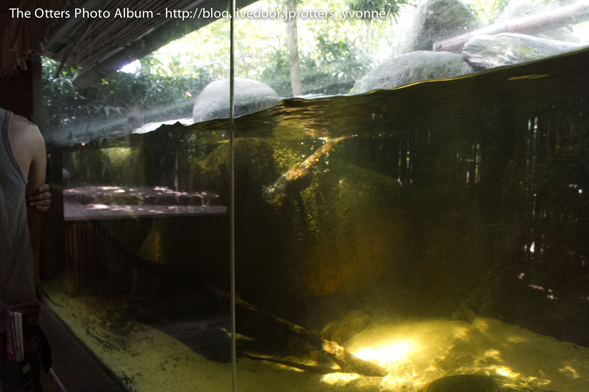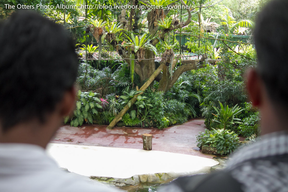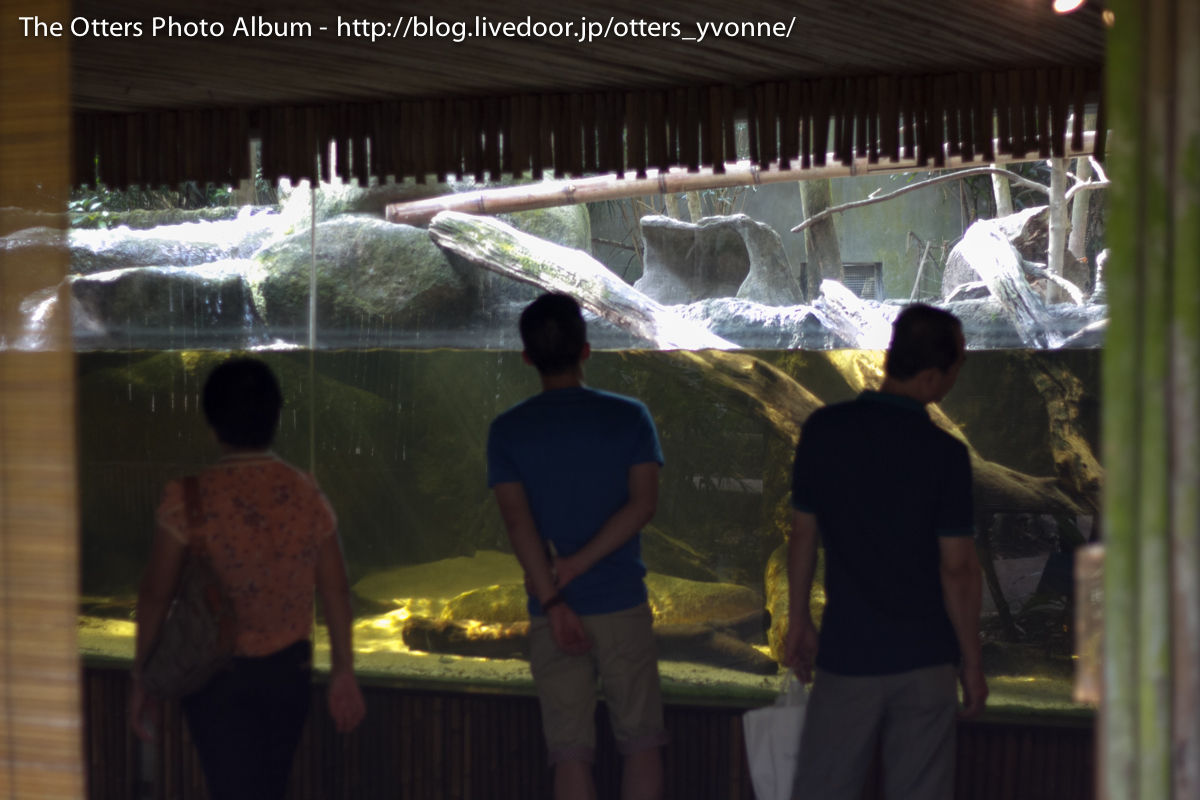 上 の写真のとおり地上にいるコツメを見下げるいわゆる普通の屋外展示と、水中でのコツメの様子を観察しやすいような作りの展示とがあります。お互いに隣接し ており、どちらもバックヤードは先の記事で示した写真の一ヶ所だけのようなのですが、観客からはまったく別の展示に見えます。彼らが屋外で私たちが半屋内 に居ます。