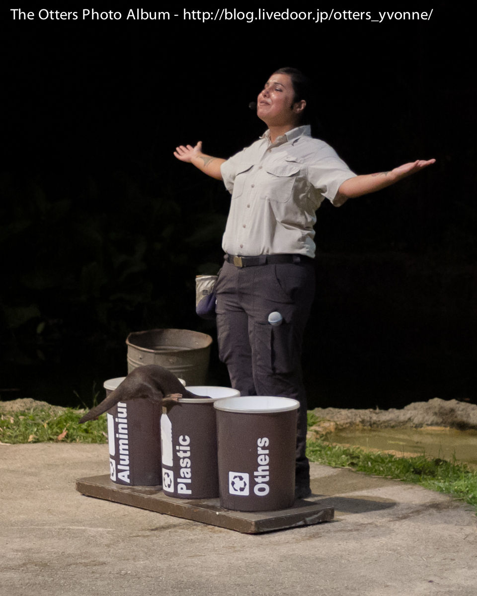 で、 とにかくフラッシュだけはぜったいに炊くな、と何度も繰り返しアナウンスしていました。(じつはショーが始まってからもお客さんのフラッシュが光ることが 何度かあってその都度喋りを止めて「フラッシュはやめて、切り方が分からないなら撮らないで、それだけはお願いだから守って」とゆーっくりな英語でおっ しゃっていました…)